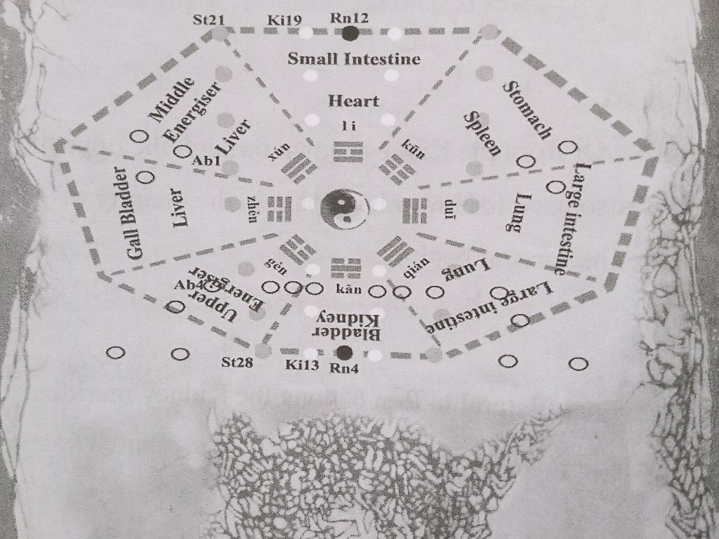 The shape/layout of the Bagua makes one think of the internal organs (Zangfu organs), as its network points echo our internal organs. If there is an imbalance or blockage in our internal organs, the corresponding abdominal reflex points as presented in the Bagua Chart are treated. Abdomen acupuncture aims to regulate the flow of Qi and blood of the internal organs through the needling of only the abdomen points.